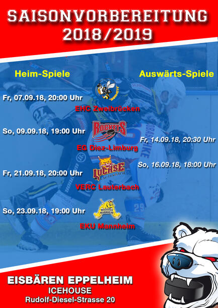 Los geht es wie in der Hauptrunde gegen die Hornets aus Zweibrücken, in der Vorbereitung jedoch mit einem Heimspiel am 07. September. Es folgenden die Spiele gegen die EG Diez-Limburg, wobei das Hinspiel am 9. September im Icehouse statt finden wird, das Rückspiel in der Folgewoche am Freitag. Nur zwei Tage später steht das nächste Auswärtsspiel an, dann bei den Luchsen aus Lauterbach, eher man am 21. September das Rückspiel im Icehouse bestreiten wird.